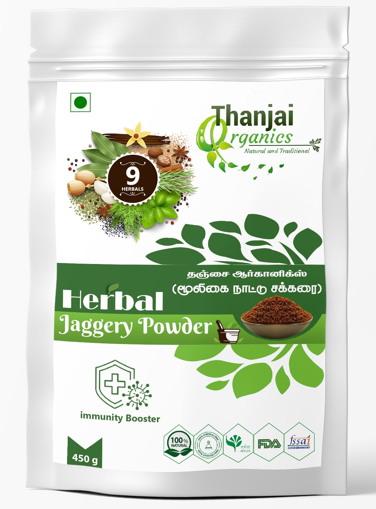Discover the unique goodness of Thanjai Organics Herbal Jaggery, crafted from our homegrown sugarcane. This isn’t your ordinary powder – it’s a blend of 9 powerful herbs, each a treasure trove of benefits for your body.
