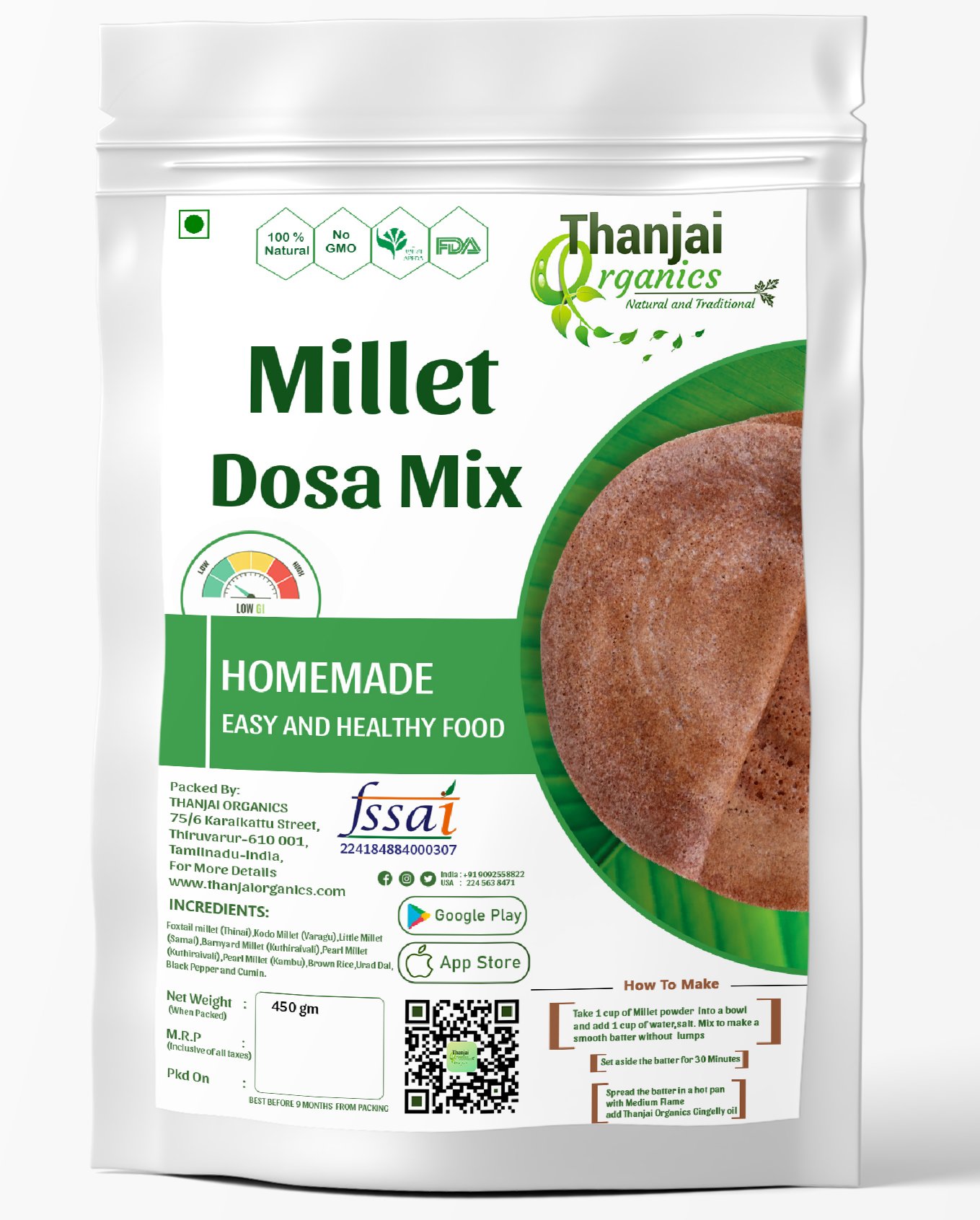 Our Millet Dosa Mix available at Thanjai Organics online, you can enjoy the goodness of millets at your convenience.