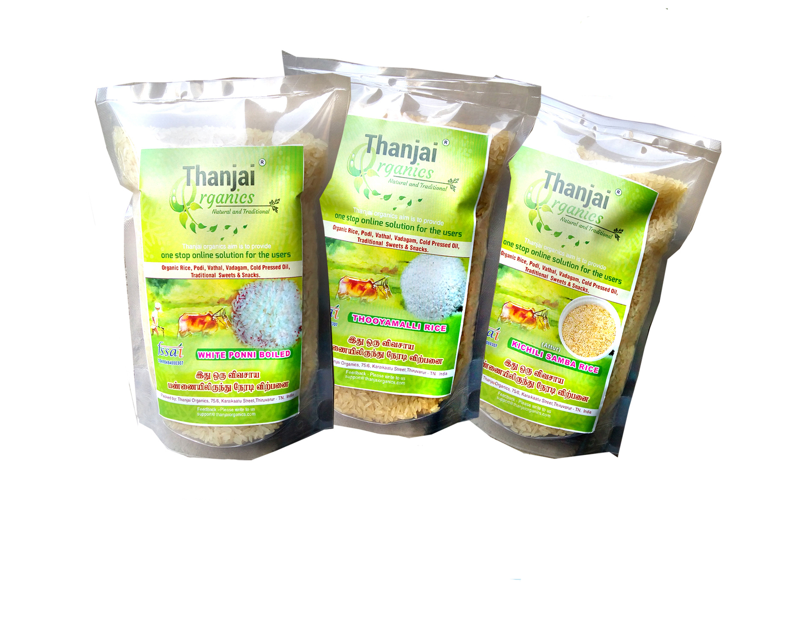 Traditional Rice(Arisi) Variety strengthens nervous system and immune System. Organic Traditional Rice(Arisi) contains Calcium and Iron.This organic Rice(Arisi) Combo Pack contains Kichili Samba Rice(Arisi), Thooyamalli Rice(Arisi) and Thanjavur Ponni Boiled Rice(Arisi). Each Traditional Rice(Arisi) Kichili Samba Rice, Thooyamalli Rice and Thanjavur Ponni Boiled Rice Contains more Health Benefits. Buy organic Traditional Rice(Arisi) Online. We Provide Best Quality Rice In india.